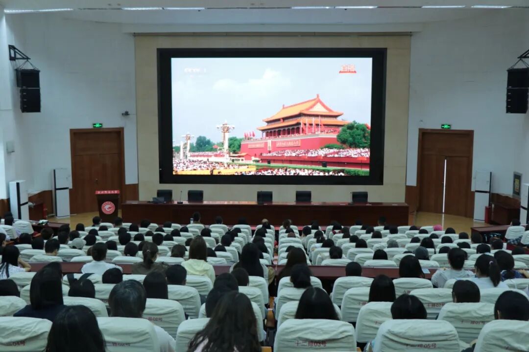 9月3日上午,beat365在线官网入口300余名师生齐聚公司二号报告厅,共同观看纪念中国人民抗日战争暨世界反法西斯战争胜利80周年阅兵仪式直播。现场气氛庄重热烈,师生们神情专注,秩序井然。