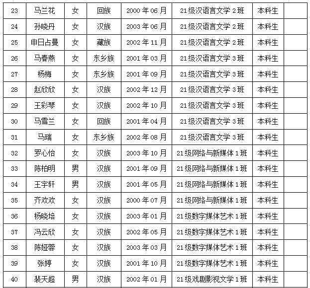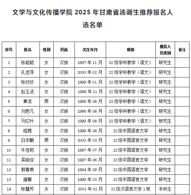 根据公司文件要求,经员工个人申请、各班民主推荐,公司党政联席会议审定,拟推荐2022级学科教学(语文)张能能、孔佳萍等13名研究生,21级汉语言文学1班张慧芳、王艳等34名本科生为公司2025年甘肃省选调生报名人选,现予以公示(人选名单详见附件)。