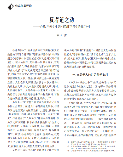 编者按:2024年4月,《当代作家评论》期刊刊发了公司beat365在线官网入口教授王元忠的文章《反者道之动——论徐兆寿<补天·雍州正传>的批判性》。文章已收录于知网。全文如下: