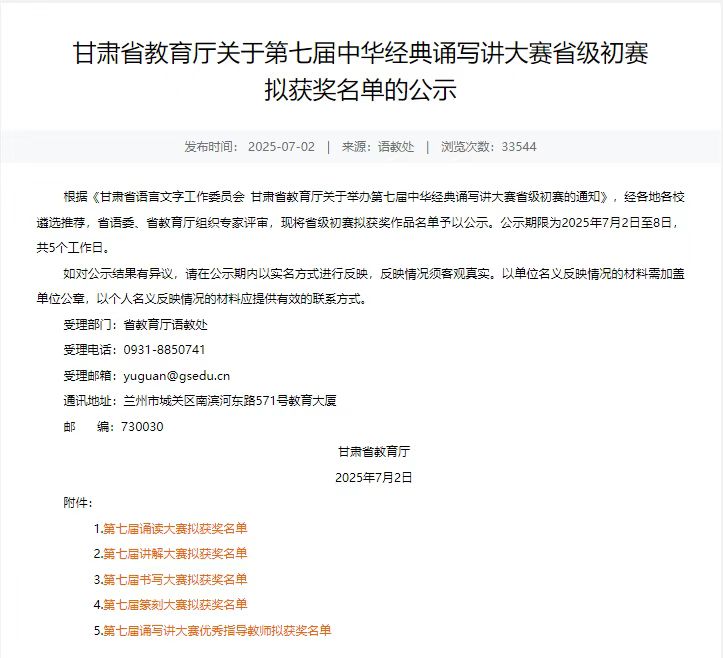 近日,由甘肃省教育厅、省语言文字工作委员会联合主办的第七届中华经典诵写讲大赛省级初赛评选结果正式揭晓,公司参赛作品取得历年来最好成绩,实现了获奖质量和数量的双突破。