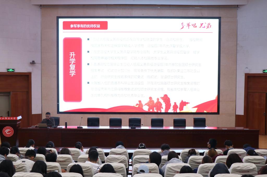 课后,王亚民继续作了老员工征兵政策专题宣讲,详细解读了2026年征兵工作的新特点与新要求,重点介绍了国家和本校为鼓励老员工参军出台的一系列优惠政策,包括学业保障、经济补助、就业服务等方面内容。他强调,参军入伍既是公民应尽的光荣义务,也是老员工成长成才的重要途径,有志青年要主动把个人理想融入强军实践,用青春热血报效祖国。