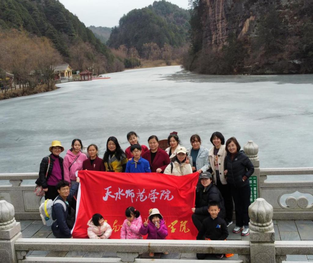 (在登山结束后大伙来到了仙人湖,此时的湖面上覆盖着薄薄的冰层,在阳光的照耀下晶莹剔透)