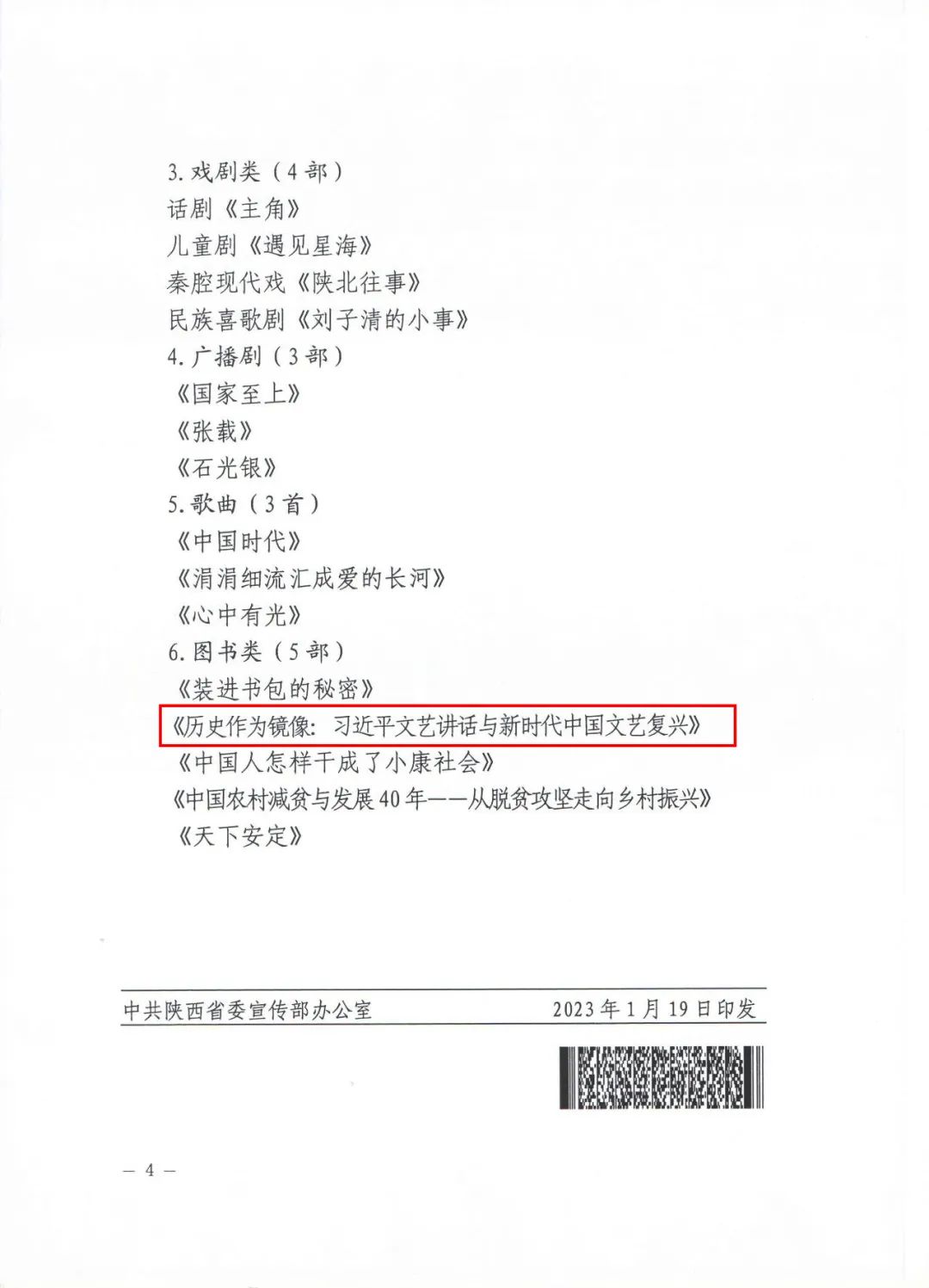 近日,中共陕西省委宣传部公布陕西省第十六届精神文明建设“五个一工程”获奖名单,总社《历史作为镜像:习近平文艺讲话与新时代中国文艺复兴》(王贵禄 著)荣获“五个一工程”优秀作品奖。