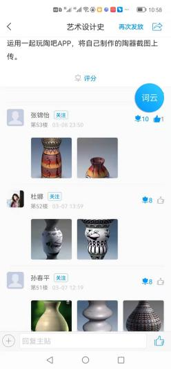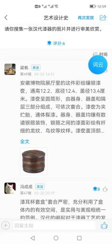 课前环节。我主要借助于超星学银在线的课程教学视频,课前让员工完成视频观看,对经典设计作品进行审美感知和初步审美鉴赏,讨论并上传学习通,对员工的审美鉴赏进行评价打分。同时,以任务驱动的方式,每个小组分配不同的课中讨论问题并准备课件;介绍与课程内容有关的虚拟仿真实验和相关APP,让员工利用虚拟仿真实验沉浸式地体验传统工艺流程;推荐玩陶吧APP小程序等,让员工自己烧制个性化陶瓷器,激发员工学习兴趣,为有效课堂教学做充分的准备。