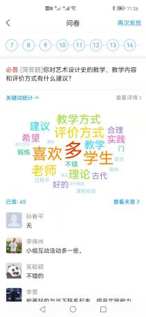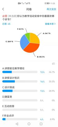 课堂教学。课中运用超星学习通+腾讯会议直播的方式,设计丰富的课堂活动,激发员工的热情。如用抢答和选人,让员工能紧跟教师讲解的思路进行思考并讨论,教师及时给予评价和激励,增强员工的自信心;讲解过程中层层追问,诱导员工探索解决问题;在展示交流环节,每个小组的发言员工通过投屏或屏幕共享的方式积极踊跃展示,小组之间对刚才的展示互评打分,教师激励评价;同时,教学中注重课程思政润物细无声的融入,以美育逐渐浸润员工的心田,达到真善美的价值引领。最后通过课堂测试和问卷调查,一方面对员工的学习效果进行检测,另一方面教师也及时了解课程教学中存在的问题与不足,通过反思不断改进和提升教学。